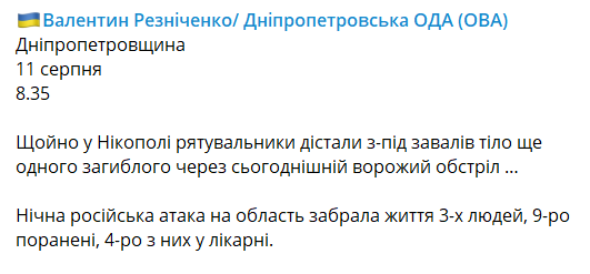 "Только что в Никополе спасатели достали из-под завалов тело еще одного погибшего из-за сегодняшнего вражеского обстрела... Ночная российская атака на область забрала жизнь 3-х людей, 9 раненых, 4-ро из них в больнице", - написал Резниченко.