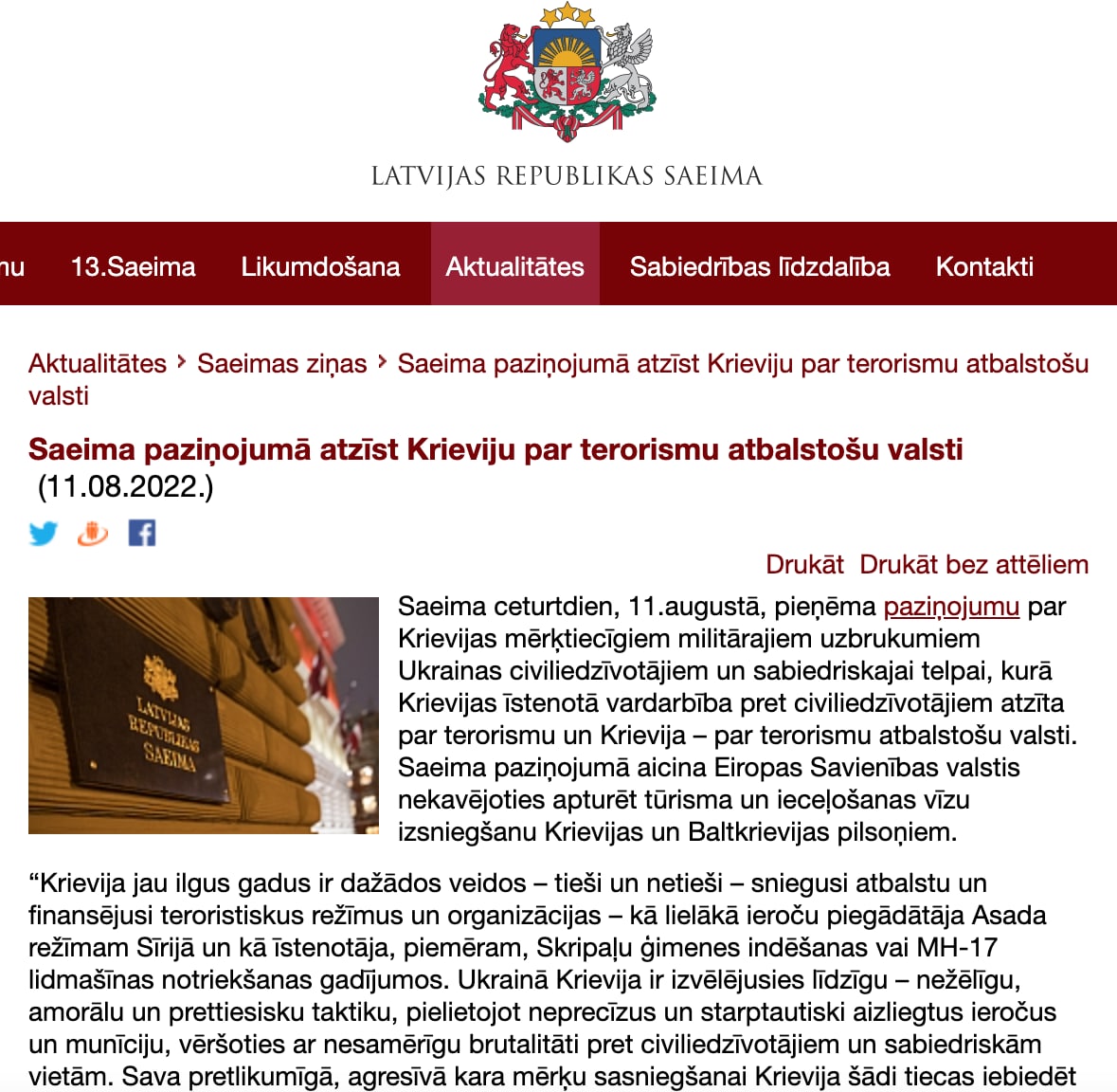 Сейм Латвии признал Россию государством-спонсором терроризма и призывает страны ЕС "немедленно приостановить выдачу туристических и въездных виз гражданам России и Беларуси".