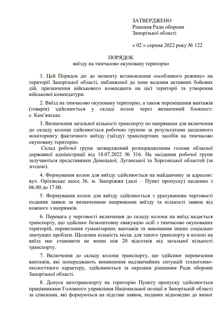 • Выезд осуществляется в составе колонн и только через определенный блокпост в селе Каменское Запорожской области.