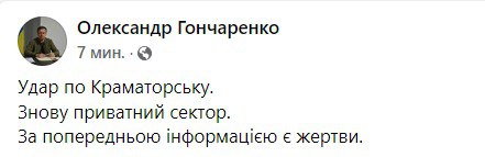 Мэр Краматорска Александр Гончаренко сообщил о новом ударе по городу.