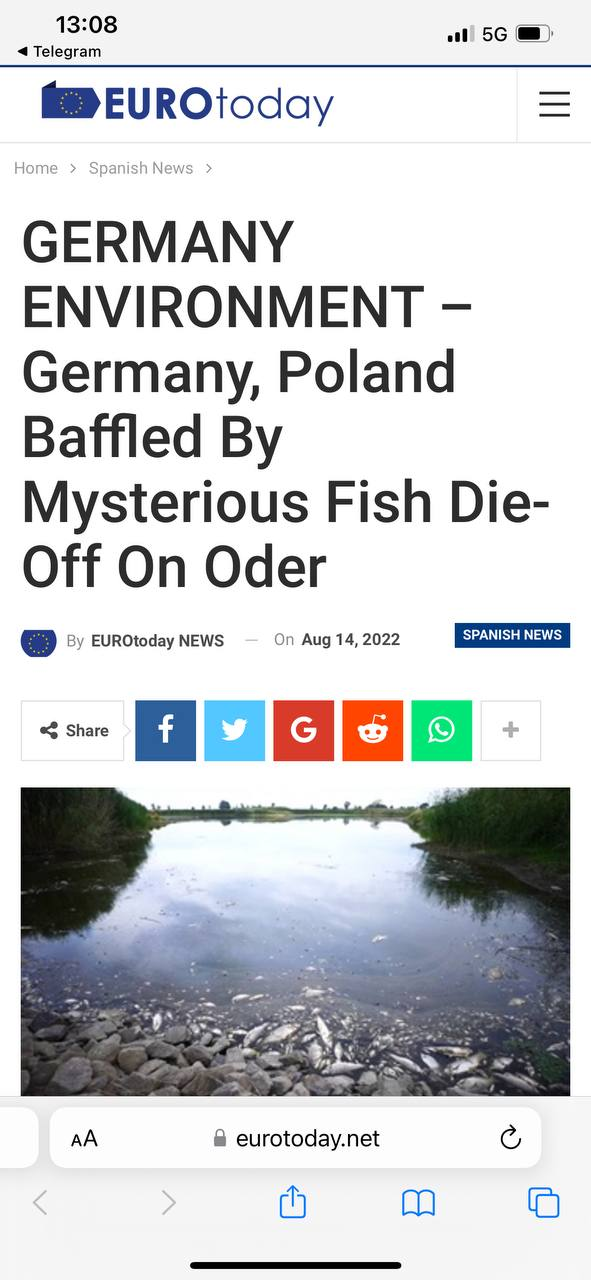 Правительство Германии призвало Польшу прояснить обстоятельства, которые привели к загадочной массовой гибели рыбы в Одере - пограничной реке между двумя странами.