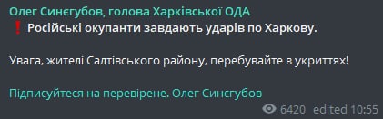 11:09 Глава Харьковской ОГА Олег Синегубов призвал жителей Салтовского района Харькова оставаться в укрытиях.