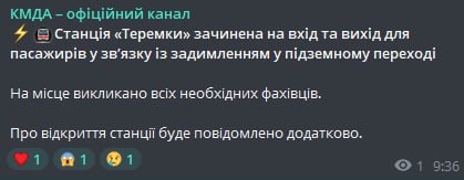 Во вторник, 16 августа, в Киеве станция метро "Теремки" закрыта на вход и выход из-за задымления в подземном переходе. Об этом сообщает КГГА.