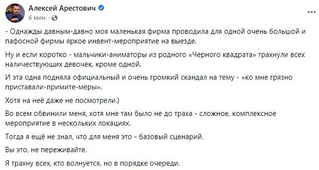 "Однажды давным-давно моя маленькая фирма проводила для одной очень большой и пафосной фирмы яркое инвент-мероприятие на выезде. Ну и если коротко - мальчики-аниматоры из родного "Черного квадрата" трахнули всех наличествующих девочек, кроме одной. И эта одна подняла официальный и очень громкий скандал на тему - "ко мне грязно приставали-примите-меры". Хотя на неё даже не посмотрели). Во всем обвинили меня, хотя мне там было не до траха - сложное, комплексное мероприятие в нескольких локациях. Тогда я ещё не знал, что для меня это - базовый сценарий.