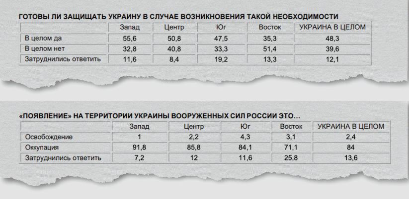 Самый острый вопрос в этом опросе появляется ближе к концу опроса: "Готовы ли вы защищать Украину в случае такой необходимости?»" В целом утвердительно ответили 48%.