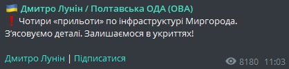 Глава Полтавской ОВА Дмитрий Лунин сообщает о четырех прилетах по инфраструктуре Миргорода в среду, 24 августа.
