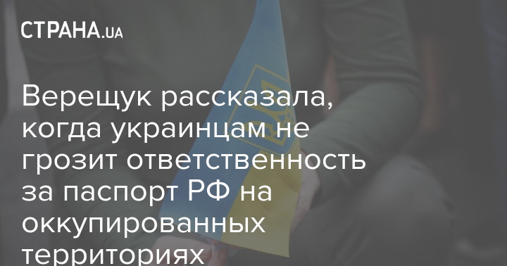 Вице-премьер - глава Минреинтеграции Украины Ирина Верещук заявила "Стране", что жителям временно оккупированных территорий Украины не грозит ответственность за получение российского паспорта, если при этом нет оснований подозревать их в коллаборационизме.