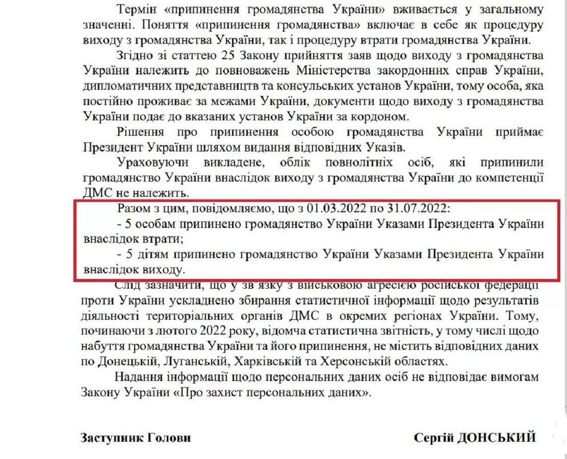 "Сообщаем, что с 01.03.2022 по 31.07.2022: 5 лицам прекращено гражданство Украины указами президента Украины в результате потери; 5 детям прекращено гражданство Украины указами президента Украины в результате выхода", – говорится в ответе.