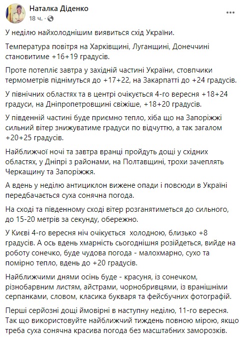 Как прогнозирует синоптик Наталья Диденко, в воскресенье самым холодным окажется восток Украины. Температура воздуха в Харьковской, Луганской и Донецкой областях составит +16...+19.