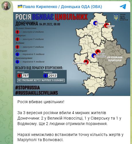 По данным главы областной военной администрации Павла Кириленко, от обстрелов за прошлые сутки погибли 4 мирных жителя: 2 в Великой Новоселке, 1 в Северске и 1 в Водяном. Еще 2 человека получили ранения.