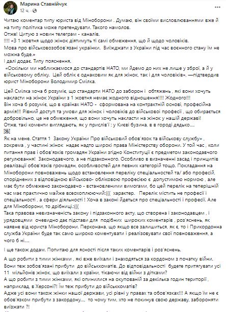 Она интересуется, что делать с теми женщинами, которые уже уехали и находятся за границей с начала войны. "Они тоже обязаны прибыть в военкоматы. К ответственности будете привлекать все 11 миллионов выехавших из страны женщин, убегающих от войны с детьми? А что делать с теми женщинами, которые оказались на оккупированной за несколько часов территории, например в Херсоне? Им тоже прибыть в военкоматы?" - пишет Ставнийчук.
