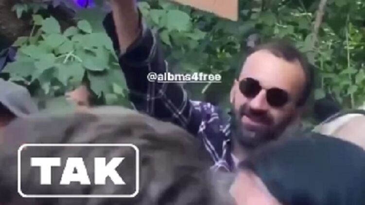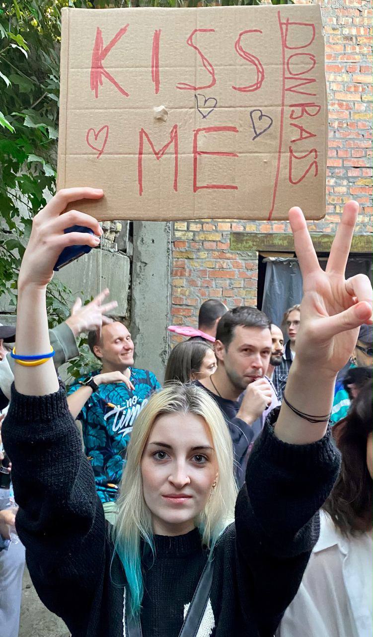 Телеграм-каналы публикуют видео, где Сергей Лещенко, один из советников Офиса президента и член Набсовета Укрзализныци, танцует с картонкой с надписью "Kiss me Donbass" (с англ. Поцелуй меня Донбасс - Ред.) на каком-то уличном фестивале.