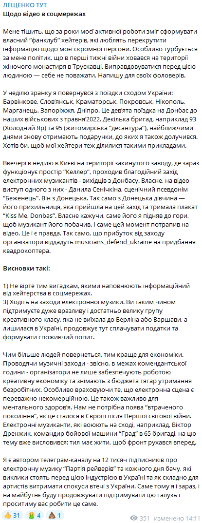 "Собственно, на видео выступление одного из [музыкантов] – Данила Сеничкина, сценический псевдоним "Беженец". Он из Донецка. Так же из Донецка девушка - его поклонница, которая пришла на это мероприятие и держала плакат Kiss Me, Donbass. Собственно, именно его я поднял вверх, чтобы музыкант его увидел. И именно этот момент попал на видео. Это и есть правда. Так же, как и то, что прибыль от мероприятия организаторы отдадут musicians_defend_ukraine на покупку квадрокоптера", - написал Лещенко.