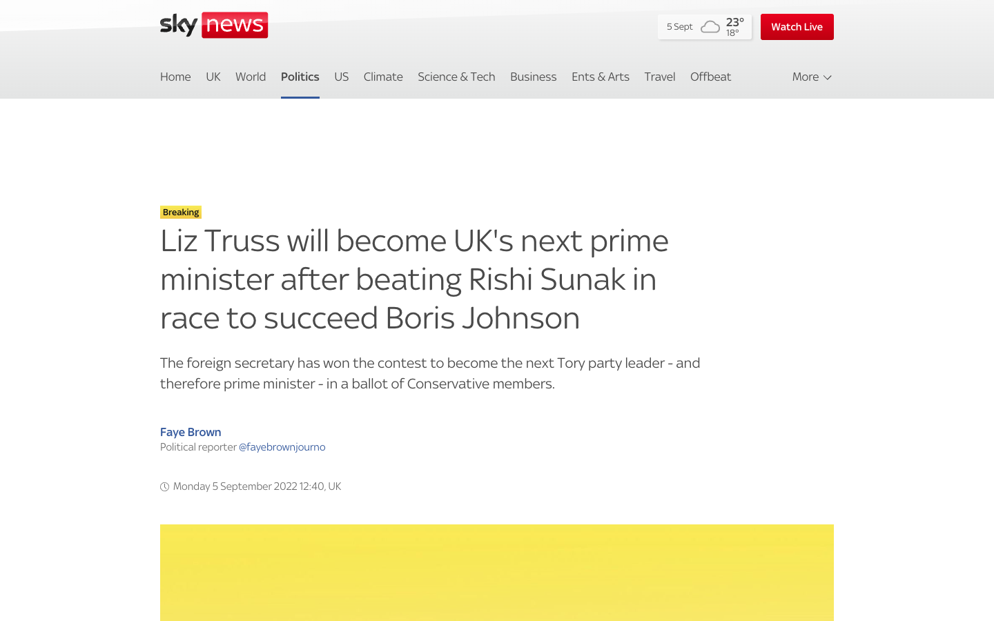 В предвыборной гонке Лиз Трасс обогнала экс-канцлера казначейства Риши Сунака. Она получила чуть более 81 тыс. голосов против чуть более 60 тыс. за Сунака.