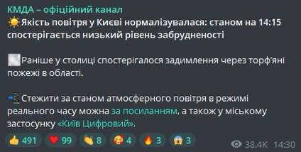 Отметим, что столица страдает от запаха гари и задымления с начала сентября. По состоянию на 4 сентября ликвидация возгораний вблизи сел Сосновка и Лесное Вышгородского района продолжалась.