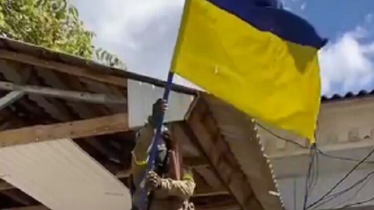 Появилось видео, как украинские военные поднимают флаг над сельсоветом освобожденного Высокополья