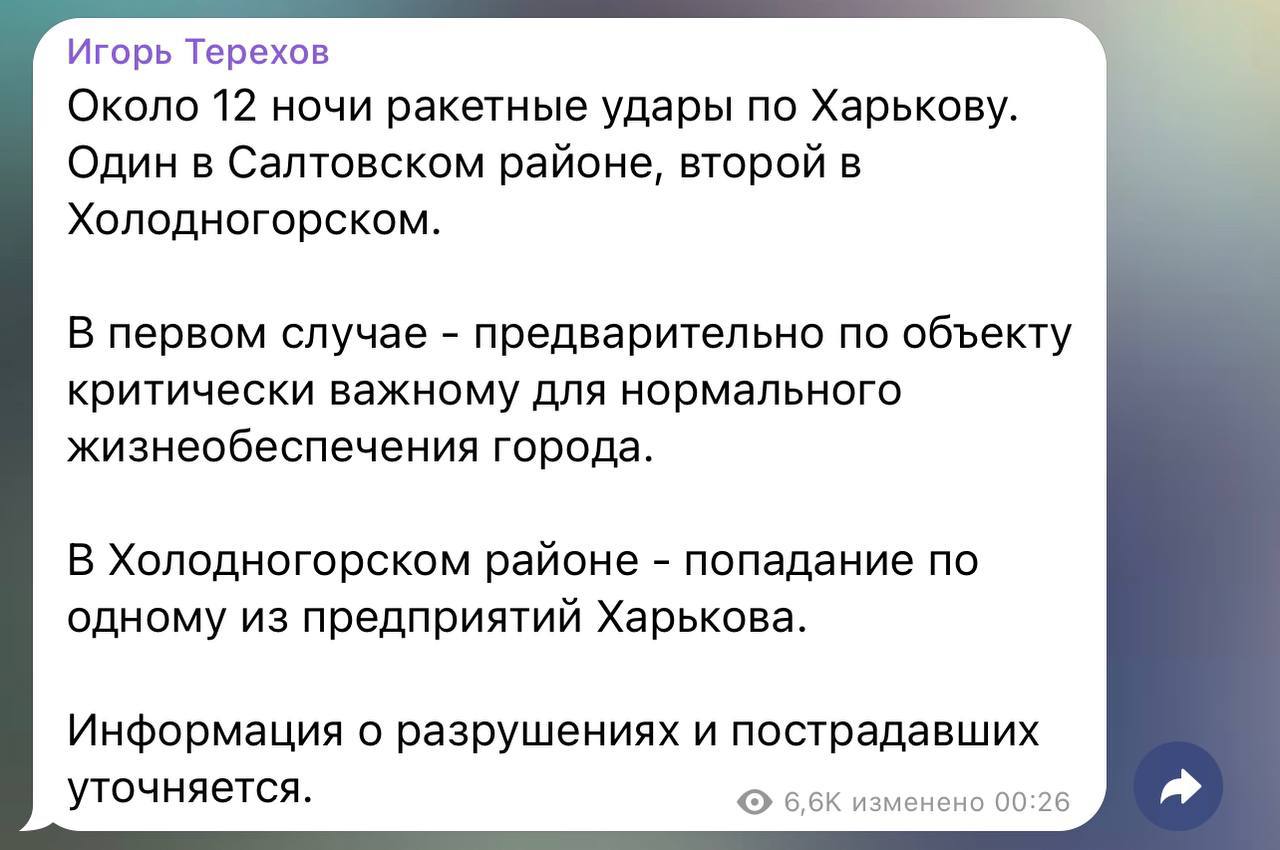 04.00 Мэр Харькова Игорь Терехов написал об ударах по Харькову ночью.