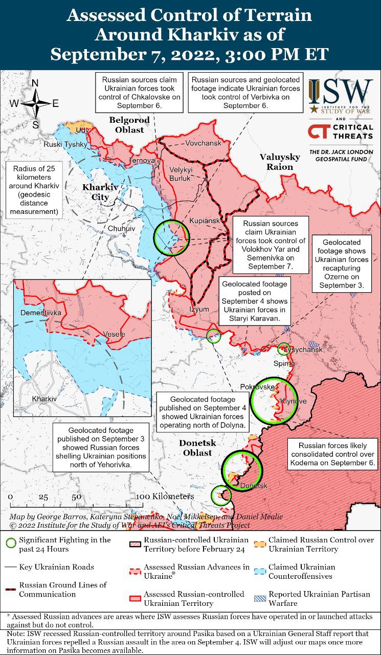 Ситуация для российских сил сложилась настолько тяжело пожалуй впервые с начала войны. Развитие наступления ВСУ грозит россиянам блокированием Изюма с севера, а затем, в перспективе - ударом по нему с юга (со стороны Донецкой области), что позволит окружить это стратегически важный город полностью.