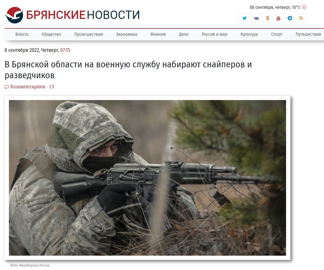 10.57 В Брянской области России (граничит с Черниговской и Сумской областями) на сайтах по поиску набирают снайперов и разведчиков, сообщают местные СМИ.