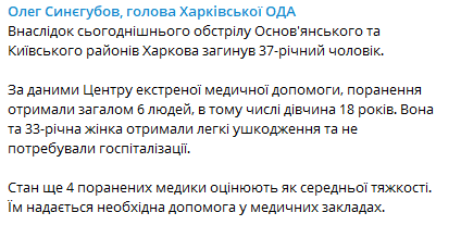 В результате обстрела Харькова погиб 37-летний мужчина, еще 6 человек получили ранения, из них четверых госпитализировали. Об этом сообщил глава Харьковской ОВА Олег Синегубов у себя в Телеграм.