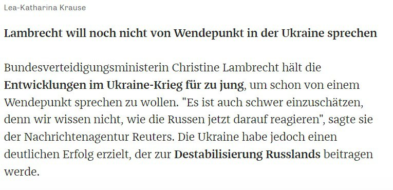 Как пишет издание, Кристин Ламбрехт считает, что события в войне в Украине произошли слишком недавно, чтобы делать выводы о поворотном моменте.