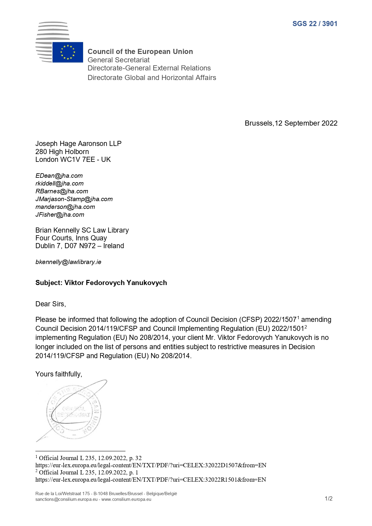 По его словам, об это Генеральный Секретариат ЕС уведомил Януковича своим письмом от 12 сентября 2022 года.