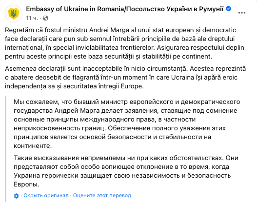 09.07 Посольство Украины в Румынии отреагировало на высказывание экс-главы МИД Румынии Андрея Марги о том, что границы Украины "неестественны".
