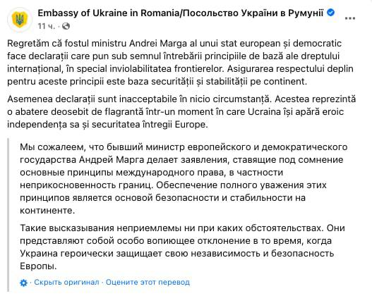 Посольство Украины в Румынии отреагировало на высказывание экс-главы МИД Румынии Андрея Марги о том, что границы Украины "неестественны".