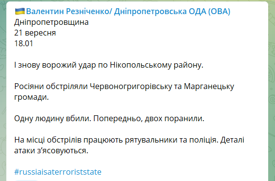 Позже удары были нанесены по Червоногригоровской и Марганецкой громадам Никопольского района. По предварительным данным, погиб один человек, еще двое получили ранения.