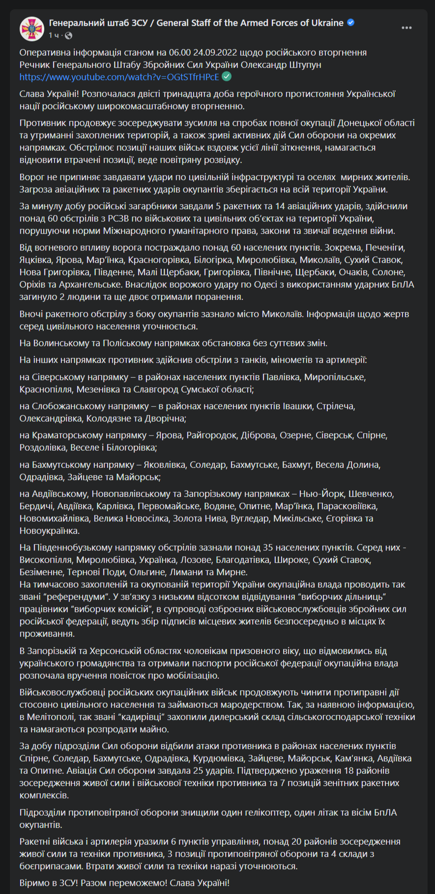 Тем временем война в Украине продолжается уже 213-й день. "Страна" следит за происходящим 24 сентября в обновляемом материале.