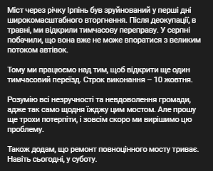 В Киевской области планируют уже до 10 октября открыть дополнительный временный переезд через реку Ирпень, чтобы облегчить автомобильное сообщение между Киевом, Бучей и Гостомелем.