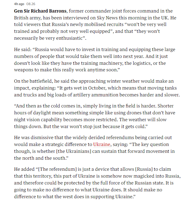 Анализируя объявленную в РФ мобилизацию, Бэрронс сказал, что российские новобранцы могут скоро оказаться на передовой в Украине. Однако они "будут не очень хорошо обучены и, вероятно, не очень хорошо экипированы" и "не обязательно будут полны энтузиазма".
