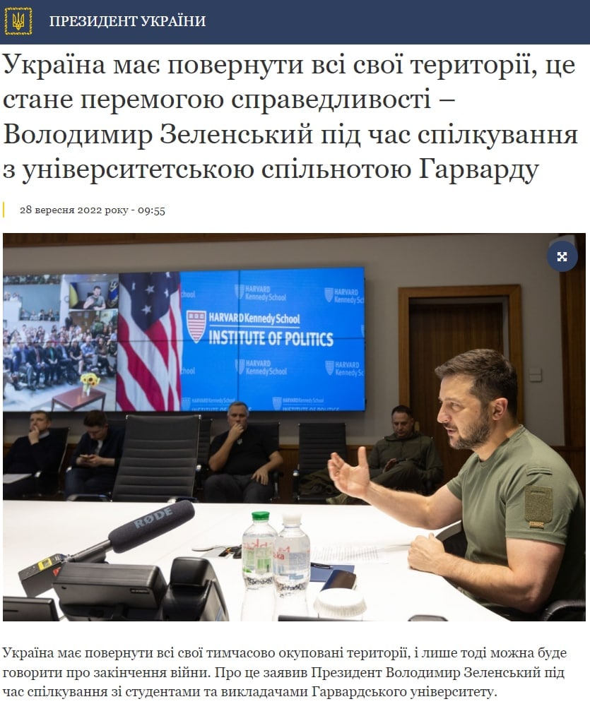 Это следует из заявления президента Владимира Зеленского во время общения со студентами и преподавателями Гарвардского университета.