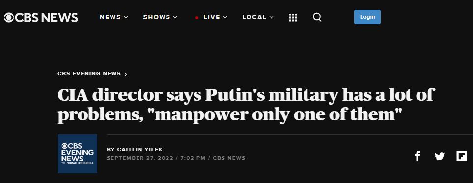 Глава ЦРУ Уильям Бернс считает, что частичная мобилизация не решит проблемы армии РФ в Украине.