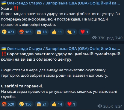 В Запорожье под ракетный обстрел попали люди, стоявшие в очереди на выезд в сторону неподконтрольной территории. Есть погибшие и раненые.