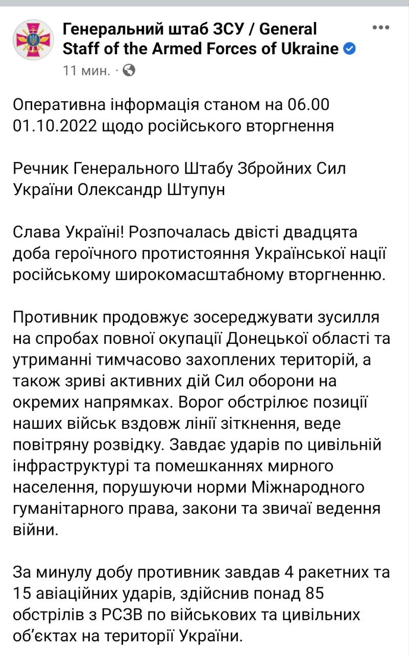 1. За сутки противник нанес 4 ракетных, 15 авиационных и 85 ударов из РСЗО. ВСУ нанесли 11 авиаударов.