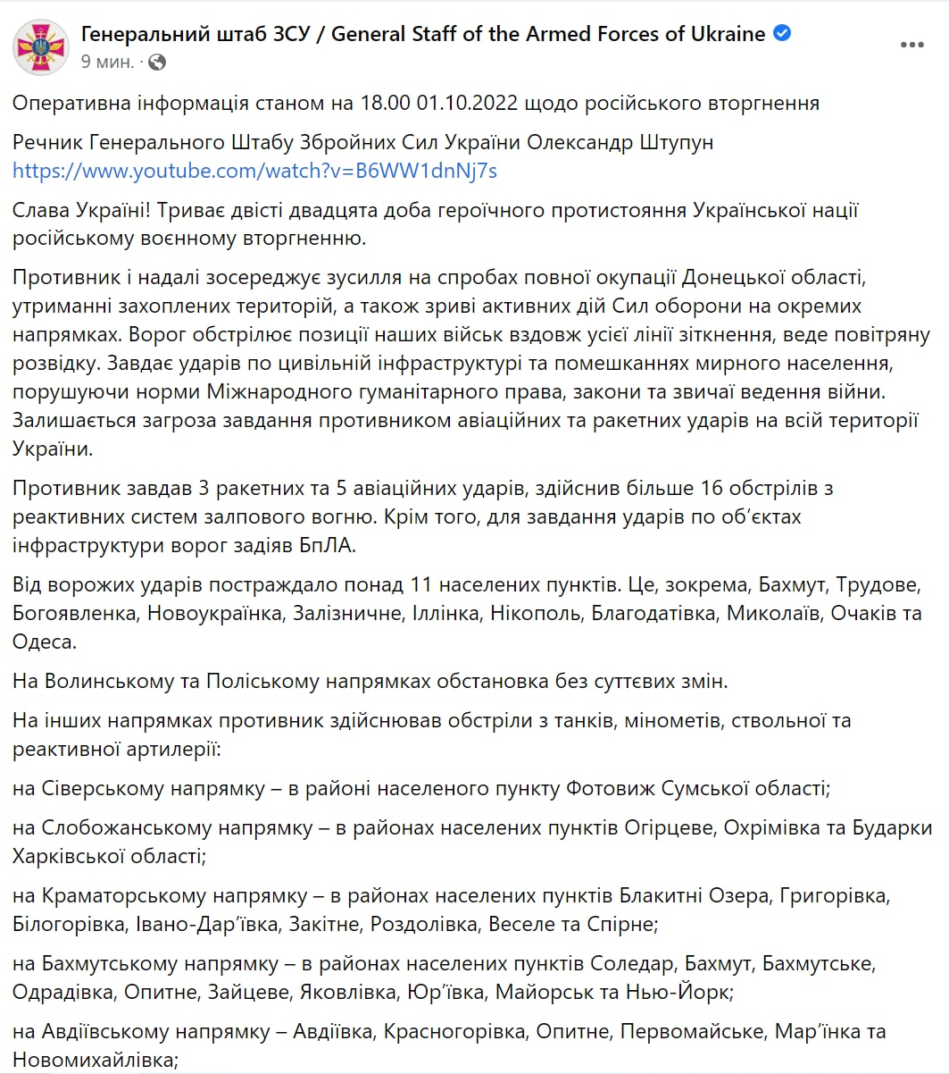 Война в Украине продолжается уже 220-й день. "Страна" следит за происходящим 1 октября в обновляемом материале.