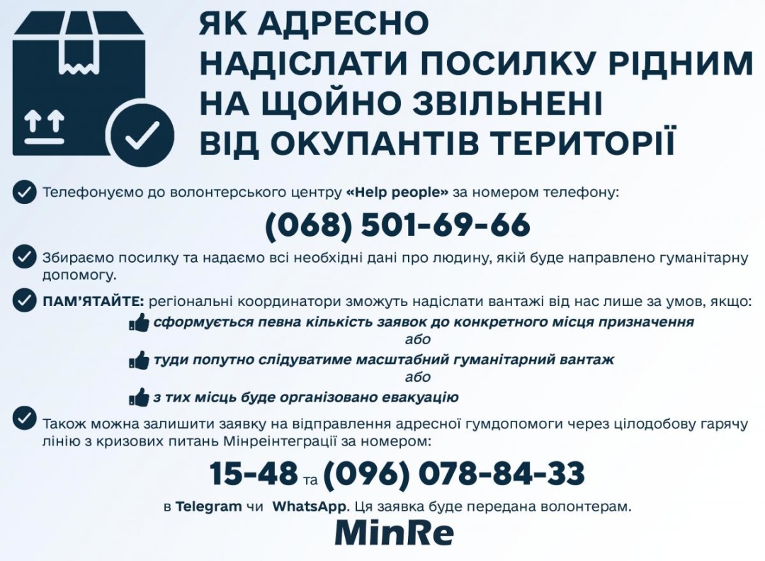 Оставить заявку на отправку адресной гуманитарной помощи можно также через горячую линию Минреинтеграции по номерам: 1548 и (096) 078-84-33. Заявку передадут волонтерам. Телефоны горячей линии работают круглосуточно.