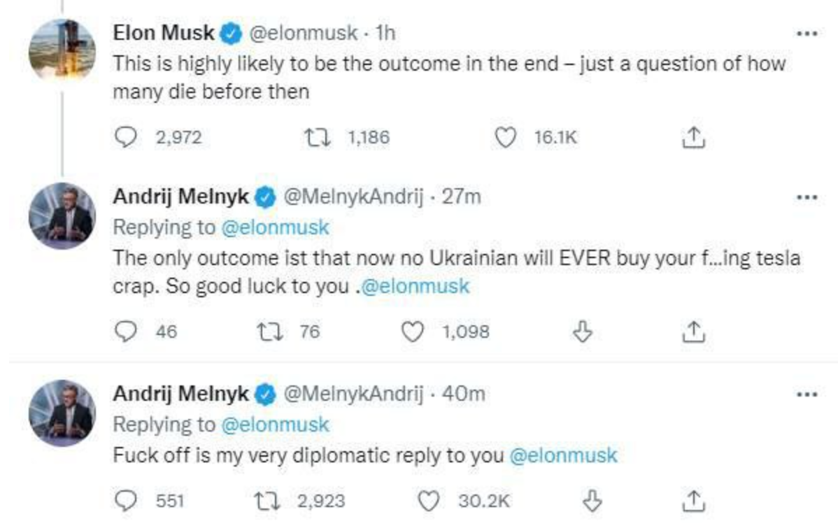 Вскоре к дискуссии подтянулся уходящий с поста посла Украины в Германии Андрей Мельник. Он высказал свое мнение Маску нецензурно, как это он часто практикует.