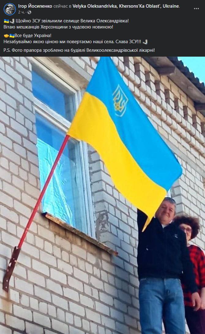 21:54 Видео установки украинского флага в Архангельском Херсонской области. О его освобождении сообщили позавчера.