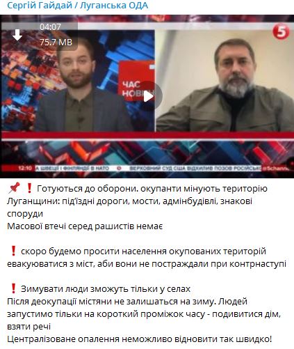 Также Сергей Гайдай указал, что оккупанты, готовясь к обороне, минуют территорию Луганщины: подъездные дороги, мосты, админздания, знаковые сооружения.