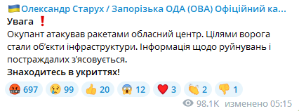 Первая информация об обстреле Запорожья появилась около 05:15. По данным главы Запорожской ОВА, россияне атаковали ракетами областной центр, а их целями были объекты инфраструктуры.