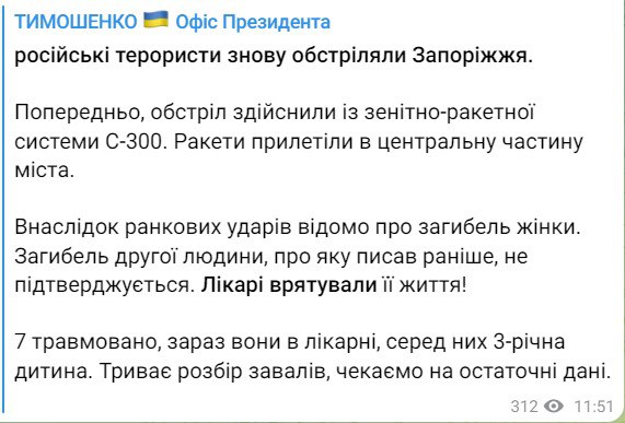 Второй обстрел Запорожья был из ЗРК С-300, сообщил замглавы Офиса президента Кирилл Тимошенко в своем тг-канале.