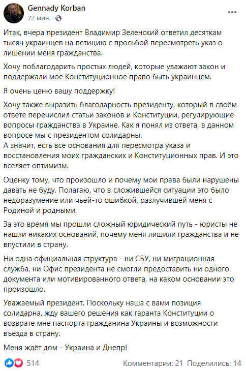 На своей странице в Facebook Корбан поблагодарил украинцев за поддержку и отдельно Корбан выразил благодарность президенту, который "в своем ответе перечислил статьи законов и Конституции, регулирующие вопросы гражданства в Украине".