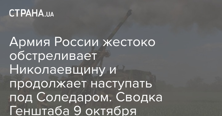 В Генеральном штабе Вооруженных сил Украины опубликовали оперативную сводку с фронта по состоянию на 18:00 9 октября. Сообщается, что российские войска наступают под Соледаром и ведут интенсивные обстрелы Николаевской области.