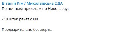 "Ночью россияне выпустили 10 ракет С 300. Предварительно без жертв" - говорится в его телеграм-канале.