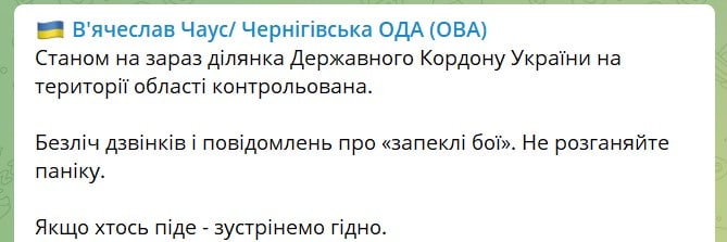 Глава Черниговской областной военной администрации Вячеслав Чаус сообщил, что участок границы с Беларусью на территории области контролированный.