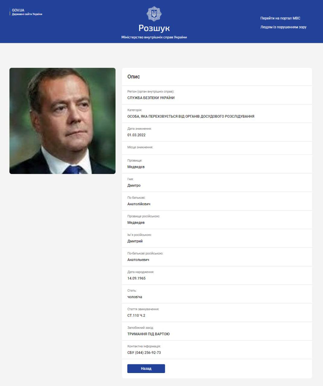 СБУ объявила зампреда Совбеза РФ Дмитрия Медведева в розыск. Карточка розыска появилась в базе разыскиваемых лиц на сайте МВД Украины.