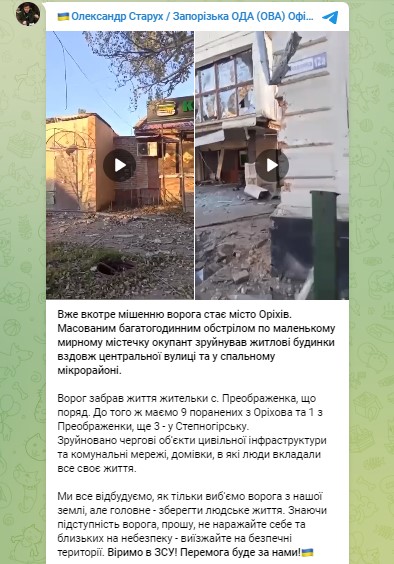 Из-за обстрелов погибла жительница села Преображенка. Также девять человек были ранены в Орехове, один в Преображенке, еще три - в Степногорске.
