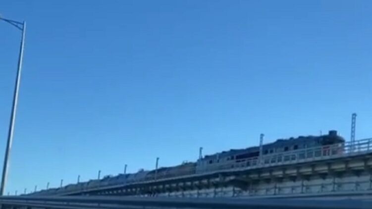 Поезда с цистернами едут по Крымскому мосту. Скриншот видео